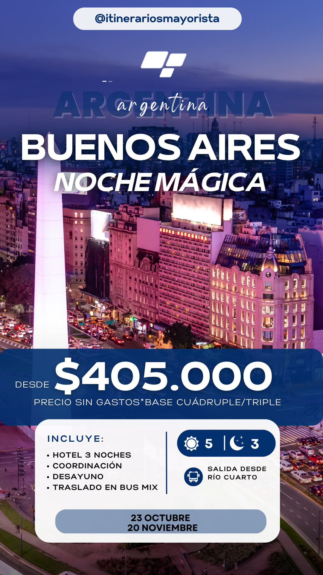 Este circuito es ideal para quienes quieren realizar una visita a los puntos más importantes de la ciudad, y conectar con la cultura clásica de la capital, junto a únicas excursiones durante los atardeceres de La Capital. Además, gracias a nuestros excelentes hoteles, ubicados en pleno corazón de la ciudad, y a metros del Obelisco y Calle Corrientes, nuestros pasajeros podrán recorrer una de las zonas más diversas de Buenos Aires; teatros, restaurantes típicos, tiendas y mucho más!