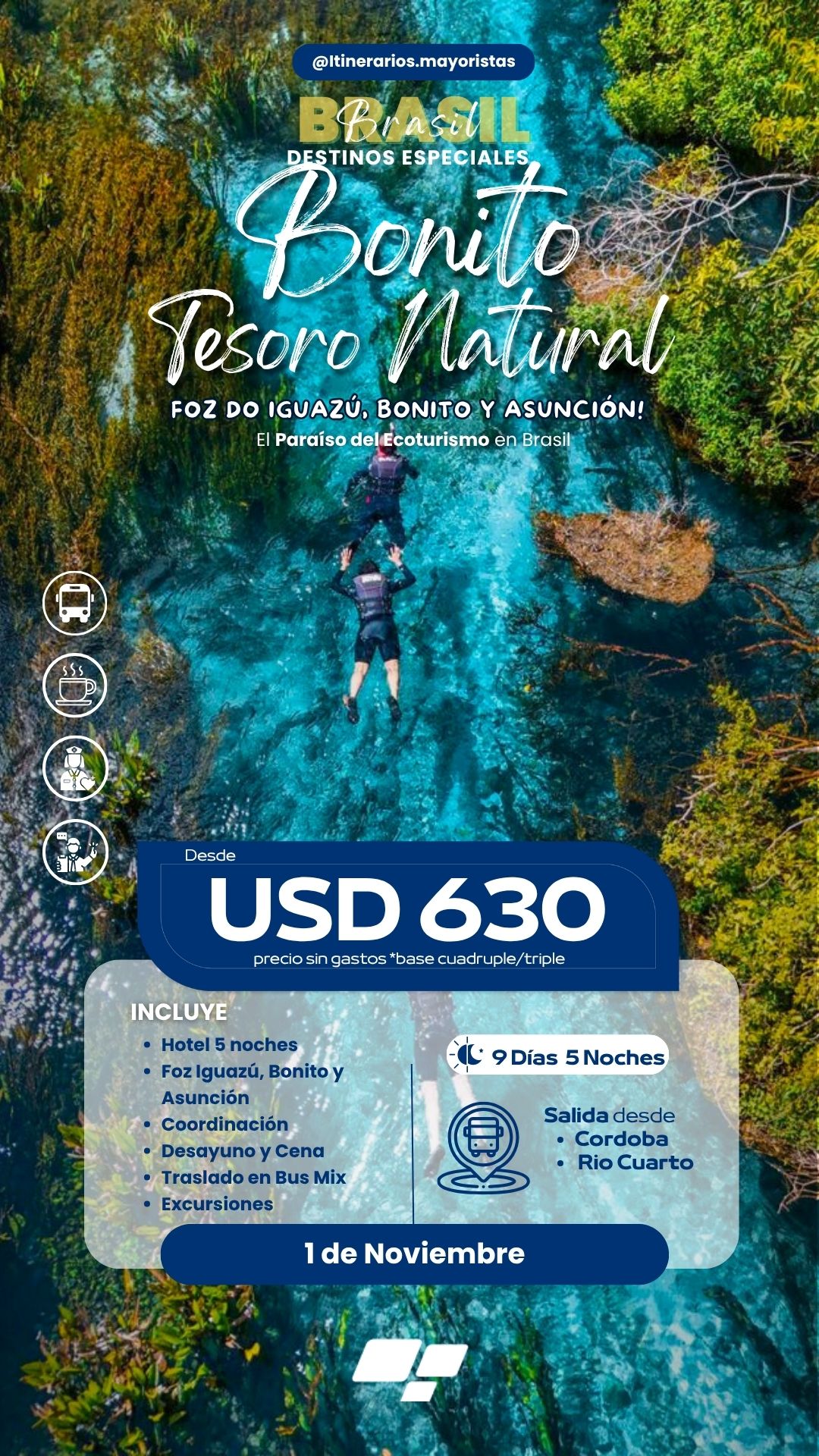 Bonito es un destino que combina la belleza natural con el compromiso con la sostenibilidad, ofreciendo una experiencia única y enriquecedora para cualquier viajero. ¡Anímate a descubrir este maravilloso rincón de Brasil! Además visitaremos las increíbles Cataratas del Iguazú y la hermosa ciudad de Asunción; no te lo podes perder!